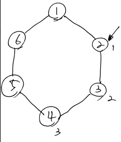 아이들이 손을 잡고 둥글게 원을 만들어 강강술래를 하고 있다. 너무 늦게까지 하다보니 집에 가고 싶은 마음이 들어, 다음과 같은 순서로 집에 가기로 했다. 강강술래를 부르면서 아이 A부터 시작해서, B번째 아이가 집에 가는 것이다.예를 들어, 6명의 아이가 손잡고 원을 그리고 있다고 하자.