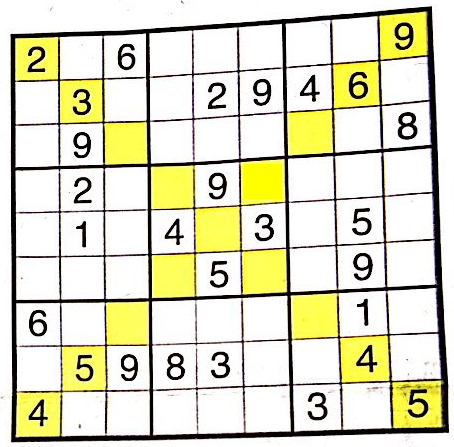X sudoku에서는 노란색으로 표시된 중앙을 지나는 2개의 대각선에도 각 숫자를 딱 한 번만 쓸 수 있습니다. 주어진 sudoku의 x행 y열에 (x와 y는 0~8) 들어갈 숫자를 출력하세요.